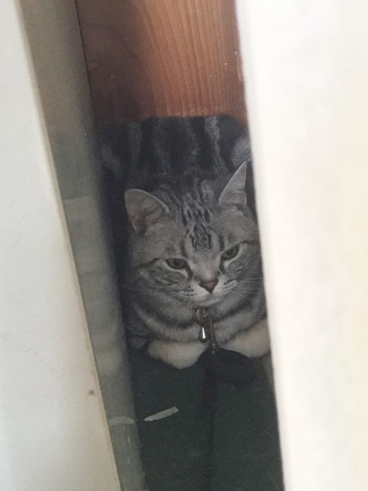 エルにゃん営業部長は雷の音にびっくりしてキャビネットの隙間にすっぽり隠れてましたとさ。